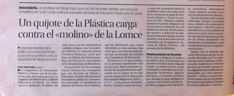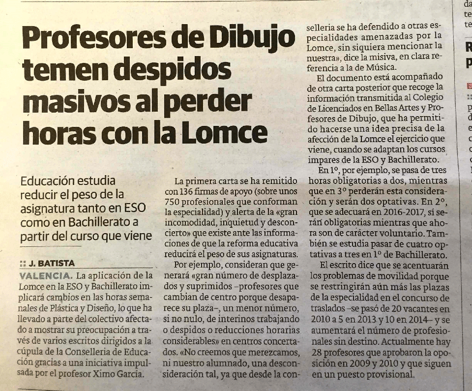 Harto de la desconsideración y menosprecio de la LOMCE y el gobierno nacional y autonómico de la Comunidad Valenciana hacia la educación artística y sus profesionales, Ximo García tiene la iniciativa de redactar una carta. La carta fue redactada y publicada en red el 25 de enero. Hasta el 12 de febrero estuvo recibiendo apoyos y adhesiones hasta los 136 profesores de centros públicos y concertados, 136 personas firmaron o apoyaron la carta.